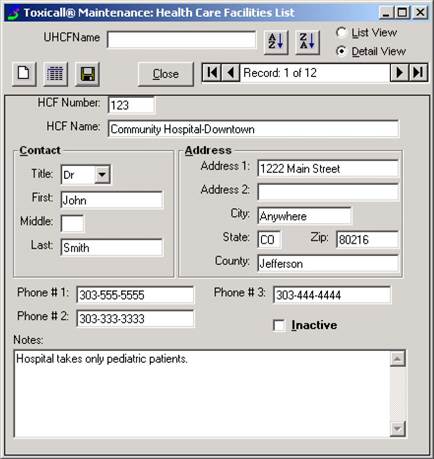 The UHCFName field at the top of the List View and Detail View screens is used as a quick search box—enter all or part of the entry you are looking for and TOXICALL® will move you to that entry, or if not found, to the one closest to where it would be.