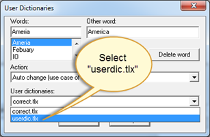 The “User Dictionaries” window will open and default to the “correct.tlx” user dictionary (used for performing auto corrections to words). Change the “User dictionaries” drop down menu to “userdic.tlx” (the dictionary containing user added words).