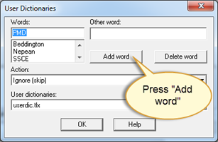If not already selected, set the “Action:” to “Ignore (skip)” to have the word ignored by the automatic spell check. Press “Add word” to add the word as shown in the image below.