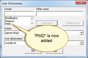 In the previous image you can see that “PMD” is not in the dictionary. You can press “Add” at this point to add the word to the dictionary. To add multiple words or see the list of words added, press the “Dictionaries” button at the bottom of the window.