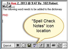 1. To access the “Check Spelling” window, select the “Spell Check Notes” icon just below the open notes area. (If you do not see the icon pointed out in the image below, check to ensure “Spell Check” is enabled in the workstation options.) Additionally, if the icon is greyed out, type a few characters into the open notes and it will become available.