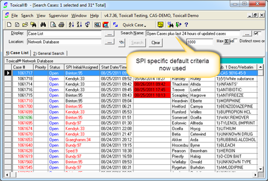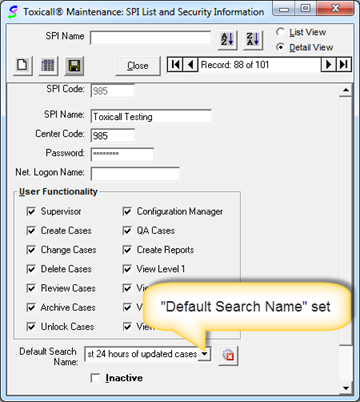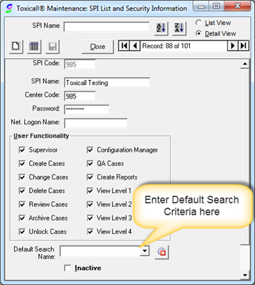 8. After the specialists re-starts toxiCALL® and opens the network database search window or selects the “Default Search Criteria” icon, the configured “Default Search Name” for the SPI will be used.