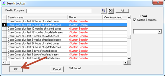5. The Default Search Criteria “Search Lookup” window will open allowing you to select the saved search criteria you desire.