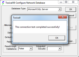 Press “OK” to close the test results window then press “OK” to save the changes made to the “Toxicall® Configure Network Database” window. toxiCALL® will exit and you will be returned to the workstation desktop.