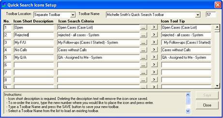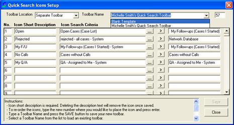 Once you have the new toolbar setup, press the “Save” button to save the new toolbar. Press the “Close” button to exit the “Quick Search Icons Setup” window. As you can see in the following screen shot, the new Quick Search Icon toolbar has been created and loaded for use.