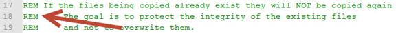 At the start of the file you will notice general information listed with the letters “REM” at the start of each line. These lines of information are commonly referred to as “comments” and are for informational purposes only and are not executed when the batch file is ran.