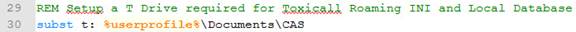 Locate the line specifying the installation location of toxiCALL®. In some instances toxiCALL® may be installed in an alternate directory and this path will need to be reflected in the batch file. The following image shows the batch file when NO changes are needed and toxiCALL® is installed in the default location.
