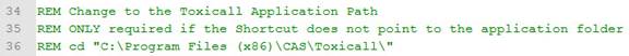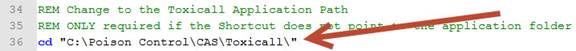 If the path to toxiCALL® needs to be updated to reflect your environment, you will un-comment the “change directory” line and update the path accordingly. The following image shows an example of an updated path.