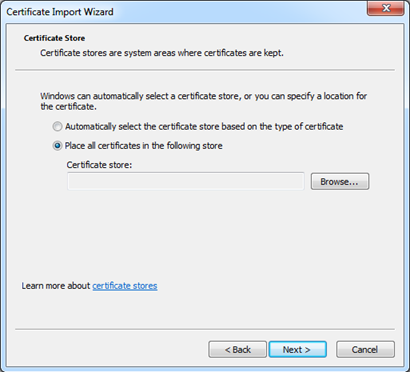 5. On the “Certificate Store” page, update the selection to “Place all certificates in the following store”.