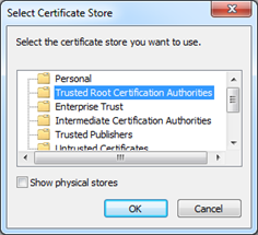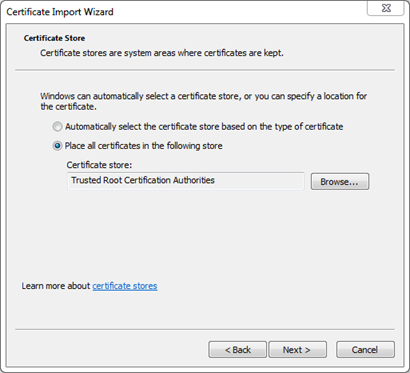 6. Select the “Browse…” button to select the store location to be used. Select the “Trusted Root Certification Authorities” store, then press “OK”.