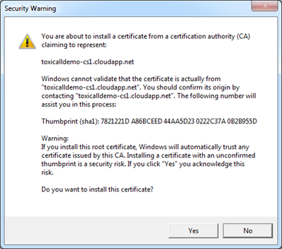 9. A prompt may appear stating the certificate is “self certified”, and would you like to continue. Press “Yes” to continue the installation. (We are currently working to have the certificate verified by a 3rd party organization.)