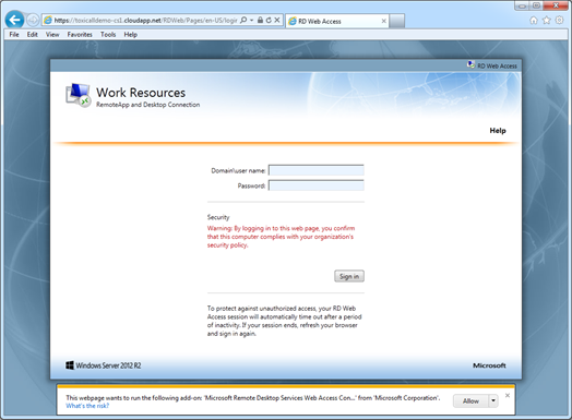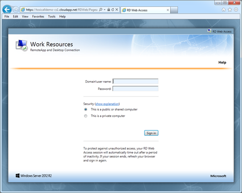 12. Open Internet Explorer and attempt to browse to the following link (https://toxicalldemo-cs1.cloudapp.net/RDWeb) you should no longer be presented with a security certificate message and be directed to a RemoteApp Desktop connection screen as shown in the following image.
