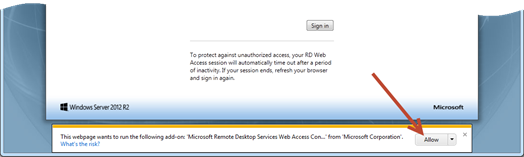 13. Note there is an Internet Explorer security prompt at the bottom of the browser window. It’s important that you allow the “Microsoft Remote Desktop Services” add-on to run. Select “Allow” when this prompt appears.