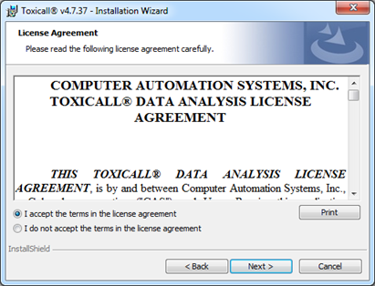 The toxiCALL® License Agreement will be presented. Review the license agreement and if you are satisfied with the terms presented, accept the agreement and press “Next”.