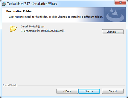 The next screen will display information regarding where the local application files will be installed. The installation wizard will default to a location of “C:\Program Files\CAS\Toxicall”. Unless there is a specific reason the application cannot reside in this directory, we strongly recommend that you leave this default location in place and press “Next”.