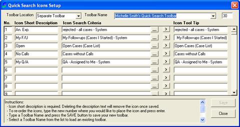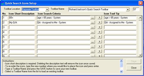 Press the “Close” button to close the “Quick Search Icons Setup” window. The selected toolbar is now ready for use.