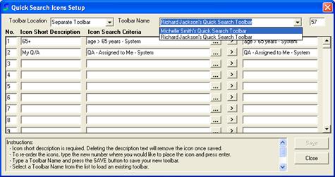 The Quick Search Icon that is most recently loaded will always be the displayed toolbar on the workstation until a different toolbar is loaded.