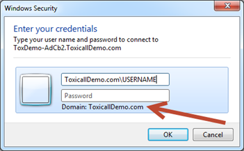 10. Enter the credentials provided to you by CAS and press “OK” to log in. Be sure the domain and user name are separated by a backslash so that the “Domain:” area updates appropriately.