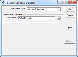 Select “Microsoft Access” as the Database Type then use the “Database:” 3-dot lookup button to select the “ToxiNet.mdb” database file stored in the System Files location.