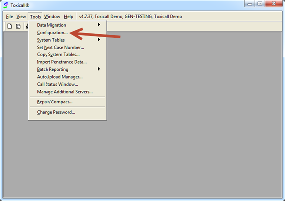 To access the “More System Configuration” screen, start toxiCALL® and log in using an account with “Configuration Manager” rights. Next, select “Tools” then “Configuration…” from the menu options.