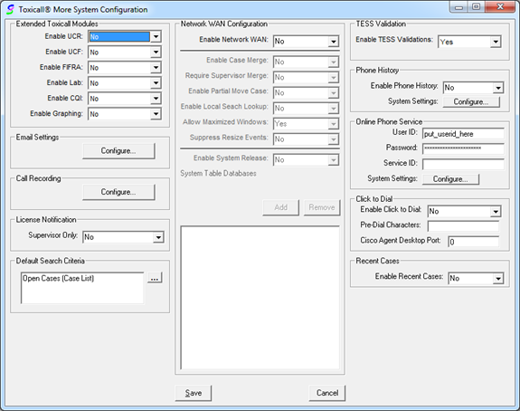 The “More System Configuration” screen allows you to make configuration changes that will affect all toxiCALL® workstations system wide.