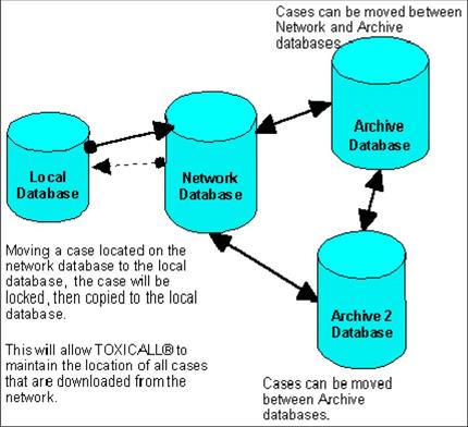 Toxicall ® allows case movement between system databases. Cases can be moved from the local to the network, network to archive, archive to archive, archive to network, and from network to local (see diagram below). Note: Sites are allowed to manage more than one archive database.