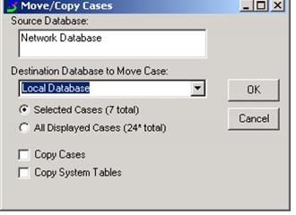 To move selected cases, highlight the cases you would like to move, then from the File menu, choose Move/Copy cases. Select the destination database from the dropdown and make sure the radio button next to Selected Cases is clicked, then click OK. Verify in the receiving database to make sure that the cases were moved as expected. If you would like the cases copied to the other database, check the Copy Cases checkbox as well. A message will pop up asking if you are sure you would like to copy these cases, click Yes. Please be aware that this will create duplicate cases on the two databases involved. This can be problematic if changes are made on both copies of the same case.