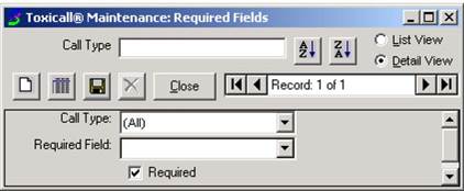 This system table allows each center to require specific fields that are not required by the AAPCC. Entries here will not override the AAPCC required fields. Required fields are based on call types and are customized by each center. Entries can be created, modified, inactivated (changed to not required) and deleted. New required fields can help your center track such information as site of exposure, weight of patient, or gender of caller.