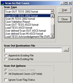 This option opens a Scan In/Out window with several choices. Cases can be scanned in from another data source (provided they use the same format as TOXICALL® or TESS). They can also be scanned out, usually this is used for manually sending a center’s data to the AAPCC’s TESS.