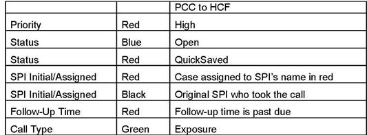 The list of cases from the Search window has color coding for different columns, below is a summary.