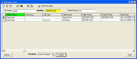 The Recent Cases window can be used to search for cases based on patient or caller phone numbers. Unlink the “Quick Search” function of the main TOXICALL® search window, the Recent Cases window ignores phone number formatting providing additional flexibility when searching.