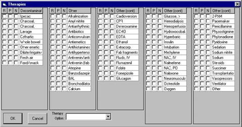 To select a therapy, click the Therapies field, center/middle portion of the open case screen. Select therapies to record and click the OK button to save. Clicking ‘Cancel’ will not save the selected therapies.