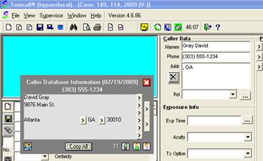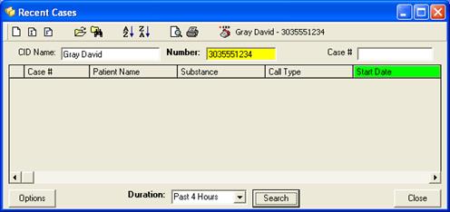 A new call is received into the poison center. Immediately the recent cases window will open (if not already open) automatically. The caller ID identifies the caller as “Gray David” at the phone number “(303) 555-1234”.