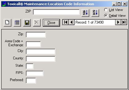 TOXICALL® ships with a table that contains national zip code information. Performing a zip code or area code lookup will enter the area code, city, state, zip code and county information. If your site uses Area Code/Exchange it is recommended that you check the table to be sure that all the entries you need will be there. As the phone company changes area codes, and the Post Office defines new zip codes, these will need to be added to your table in order for them to be visible. Entries can be created, modified or deleted from this system table.